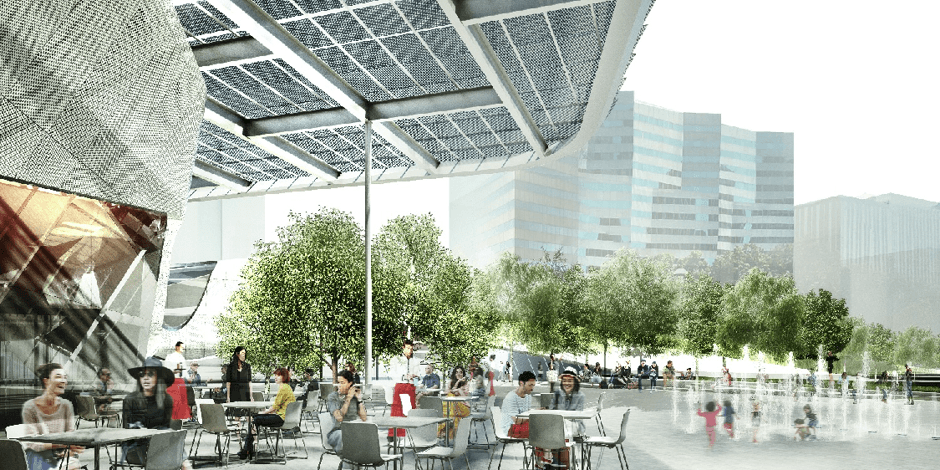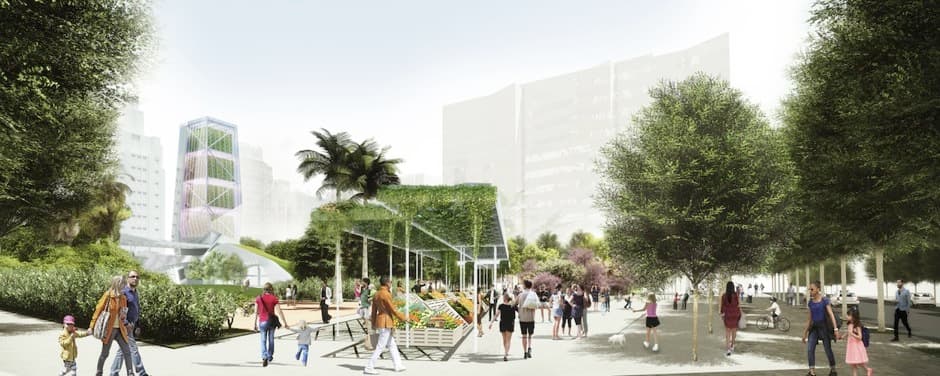 No sorprende que el plan de SWA y Morphosis sea el más futurista y arquitectónico del grupo de finalistas (también es el único plan nativo, ya que ambas empresas tienen sus sedes en el área). Esta visión de Pershing Square incluye instalaciones para la educación con una orientación tecnológica y una torre hidropónica para cultivos, la que usa energía solar, según la propuesta del equipo. El plan también incorpora características más tradicionales, entre ellas un césped central, una sección de juegos para niños, restaurantes y concesiones.