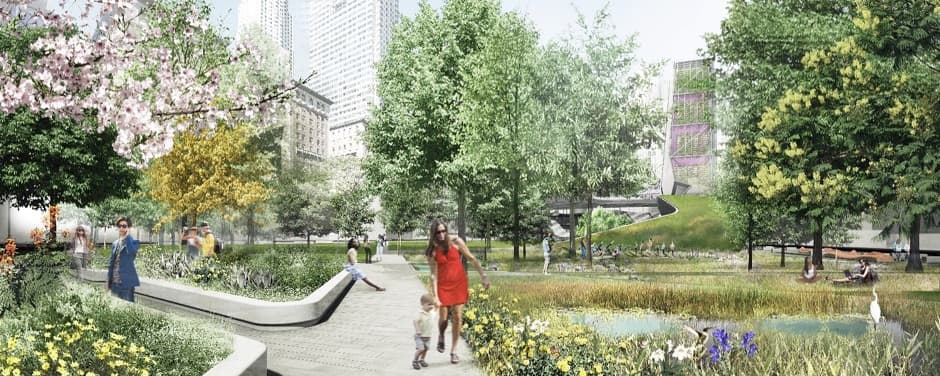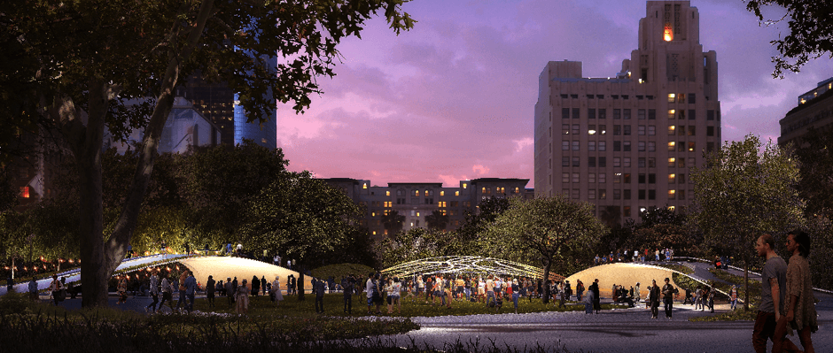 Las cuatro propuestas finalistas de lo que será Pershing Square van desde un diseño tecnológico a un parque flexible de jardines.