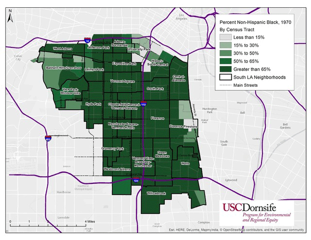 A mediados del siglo XX, éste era un suburbio blanco, de clase obrera. Pero en 1965, estallaron disturbios contra la brutalidad policial en la creciente comunidad negra de Watts, lo que ayudó a acelerar la huida de los blancos. Para 1970, la zona ya era de mayoría afroestadounidense en un 80%. En la década siguiente, los empleos comenzaron a desaparecer a causa de la desindustrialización. El desempleo, junto con la alta delincuencia y la excesiva vigilancia policial, desencadenaron un éxodo de familias negras de clase media en la década de 1990. Los latinos, procedentes de otras partes de la ciudad, se trasladaron al vecindario y lo redefinieron. Actualmente, dos tercios de la población de South LA es latina.