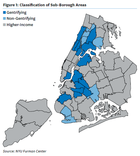El mapa abajo demuestra las localizaciones de los tres tipos de vecindarios en toda la ciudad. Los vecindarios que se están gentrificando (mostrados en azul oscuro) mayormente están ubicado en el alto Manhattan cerca de Harlem y en partes de Brooklyn, particularmente en áreas que son adyacentes a Bajo Manhattan. Se puede observar los vecindarios que no se están gentrificando (mostrados en azul claro) al lado de muchos de los vecindarios que sí están pasando por este proceso, lo cual refleja la yuxtaposición de ventaja concentrada y desventaja en la ciudad de Nueva York hoy en día.