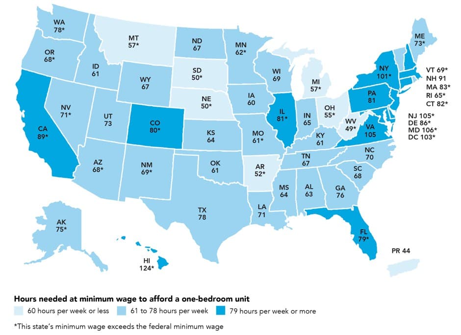 Para los estadounidenses pobres, hasta un departamento de un dormitorio está fuera de su alcance. No hay un solo estado en Estados Unidos donde un trabajador que gana el sueldo mínimo pueda costear un departamento de un dormitorio si trabaja 40 horas a la semana. El mapa de abajo muestra las horas por semana que este trabajador tendría que trabajar para costear un departamento modesto de un dormitorio en cada estado: