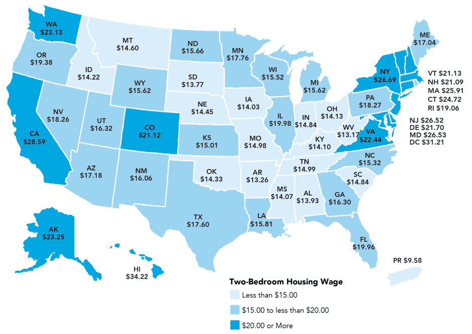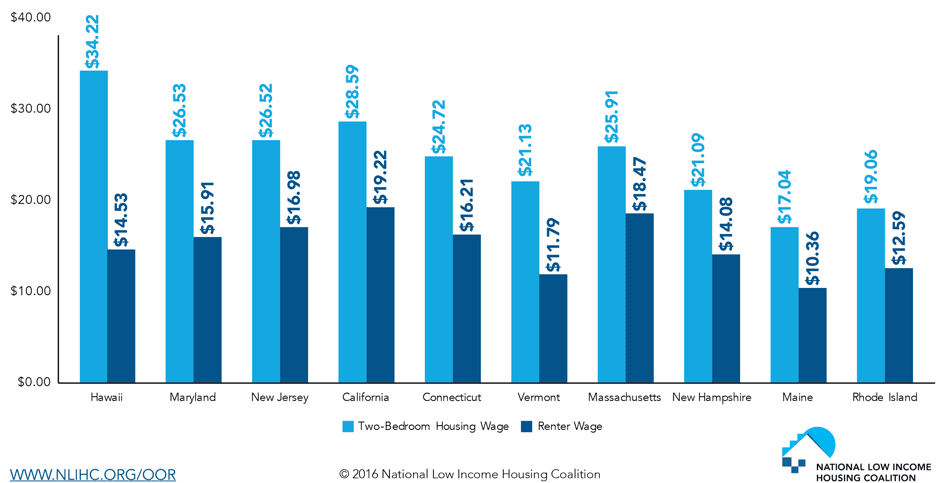En 2016 un trabajador tendría que ganar 20.30 dólares por hora para alquilar un departamento de dos dormitorios cómodamente, y sin tener que dedicar más de un 30% de su ingreso al costo de la vivienda. El año pasado NLIHC indicó que esta cantidad, la cual denomina “sueldo de vivienda”, estaba en los 19.35 dólares por hora (cabe notar que no estamos hablando de departamentos de lujo. El reporte calcula este sueldo horario promedio comparándolo con El Precio de Mercado Justo del Alquiler establecido por el Departamento de Vivienda y Desarrollo Urbano. Este precio es un cálculo anual de lo que una familia podría pagar para vivir en un departamento sencillo).