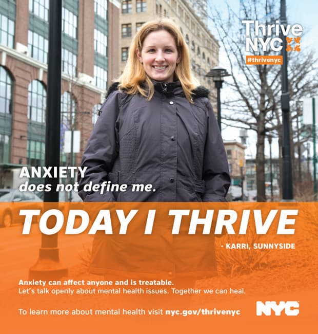 Estos letreros no son de algún grupo de presión o de una institución mental sino de la ciudad de Nueva York. ThriveNYC es un completo programa cuyos fines son mejorar el acceso a la atención médica para problemas mentales en toda la ciudad, así como romper barreras al tratamiento, las cuales incluyen el antiguo estigma cultural. Encabezado por Chirlane McCray, primera dama de la ciudad, ThriveNYC oficialmente se inauguró en noviembre de 2015, cuenta con un presupuesto de $850 millones y colaborará con veinte agencias de la ciudad en 54 iniciativas. Los anuncios en el metro son parte de una de esto, una campaña llamada “Today I Thrive” (Hoy prospero), la cual busca llevar asuntos sobre la salud mental, los cuales fueron escondidos durante muchos años, al dominio público.