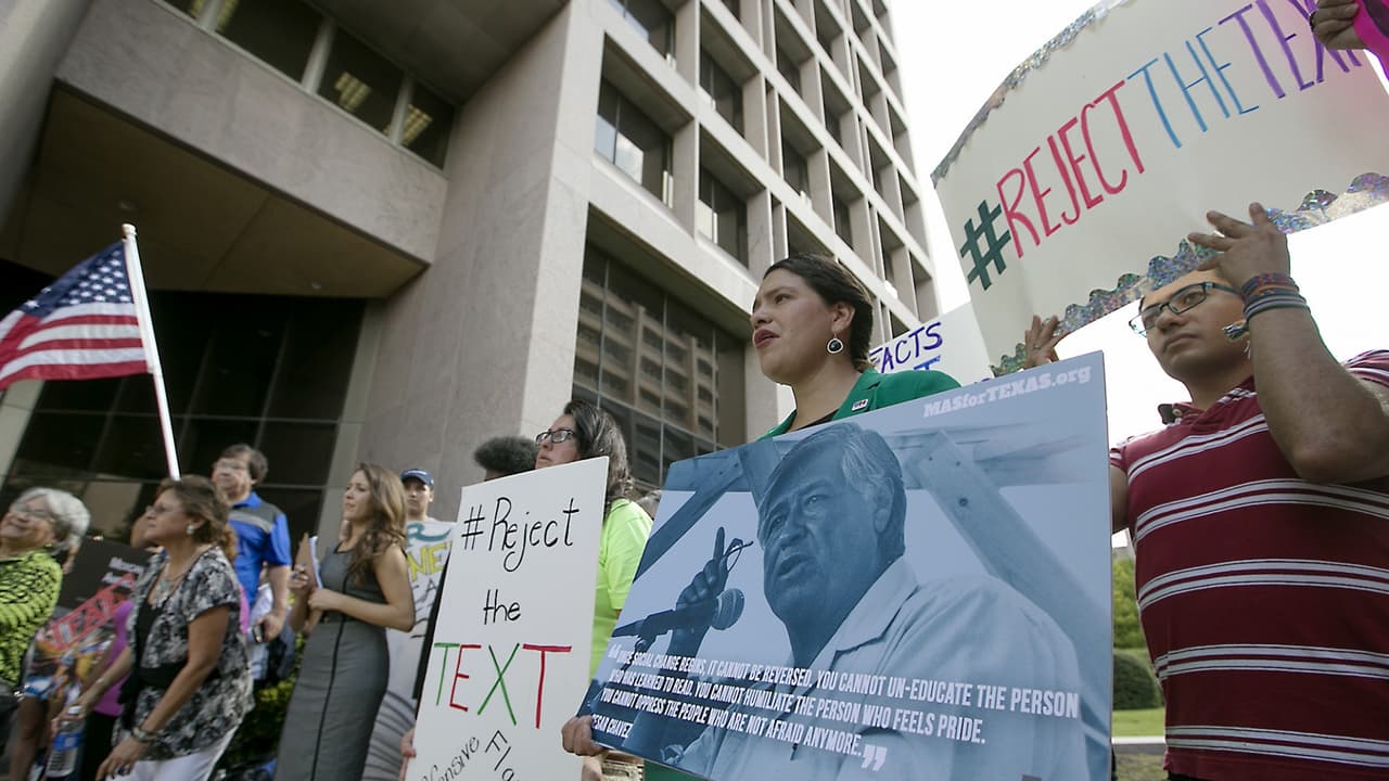 Activistas protestan contra libro escolar en Texas, lo califican ofensivo