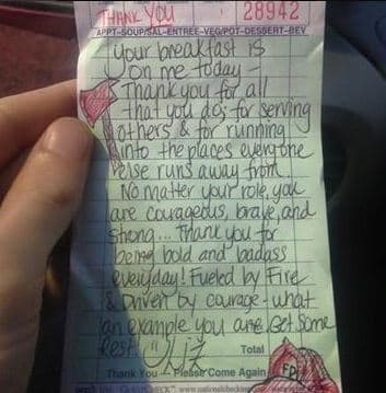 La mesera que los atendió ese día, Liz Woodward, los escuchó hablar sobre el incendio que habían estado combatiendo. Eventualmente, cuando los bomberos fueron a pagar la cuenta, se llevaron una gran sorpresa: en vez de recibir una factura, habían recibido un mensaje.