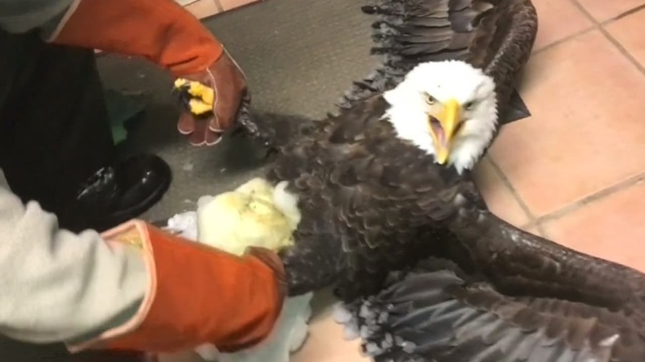 Con agua tibia salvan a una águila atrapada en una bola de hielo que no la dejaba volar