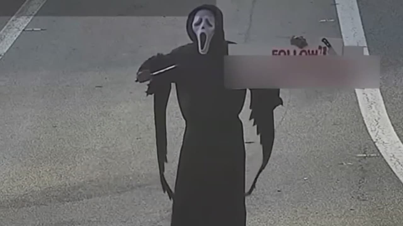 Aprovechando el día de Halloween y su aterrador disfraz, el hombre comenzó a hacer señales con un cuchillo mientras estaba en el techo de su vehículo. Te contamos lo que hizo la policía. Puedes ver en ViX más noticias gratis.