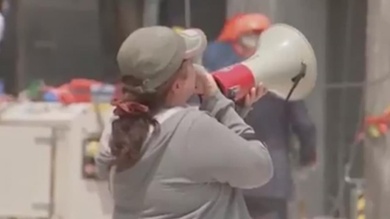 Con un megáfono esta mujer se dirige a su hermano sepultado entre los escombros en México
