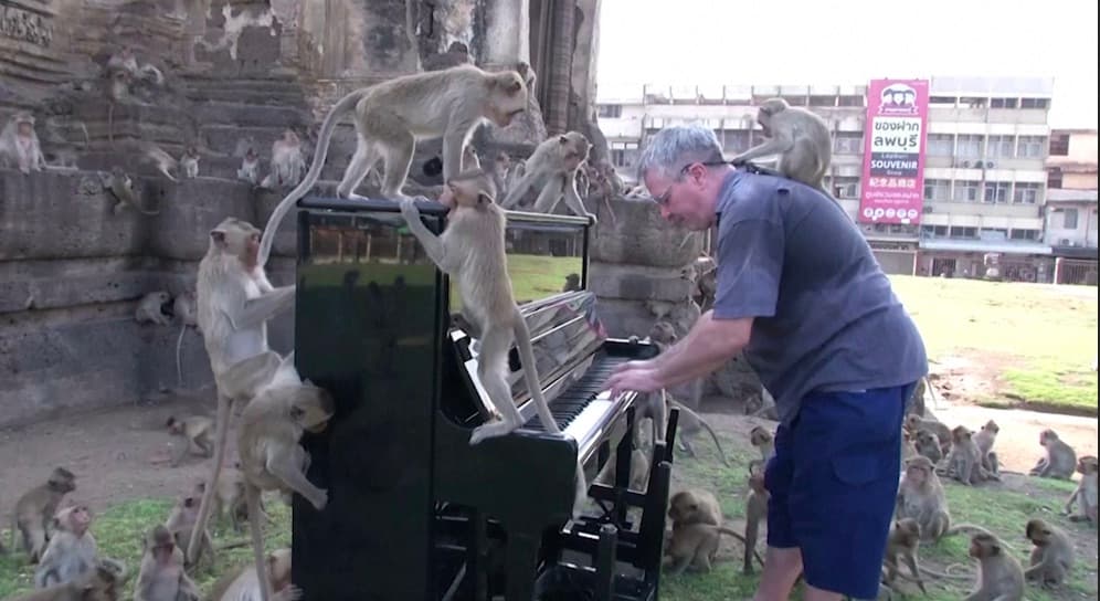 Con un mono subido a la cabeza, toca el piano para calmar a cientos de simios hambrientos por la pandemia