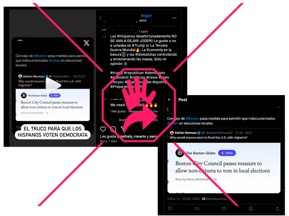 “Concejo de #Boston pasa medida para permitir que indocumentados #voten en elecciones locales”, dice el texto de la publicación hecha el 22 de enero de 2024 en Instagram y un mes antes por el mismo usuario en X (antiguo Twitter). Ambas citan, a su vez, otro post en inglés en el que aparece un titular del diario The Boston Globe sobre la aprobación de un texto que busca dar derecho al sufragio a “no-ciudadanos” en comicios locales de la capital de Massachusetts.
