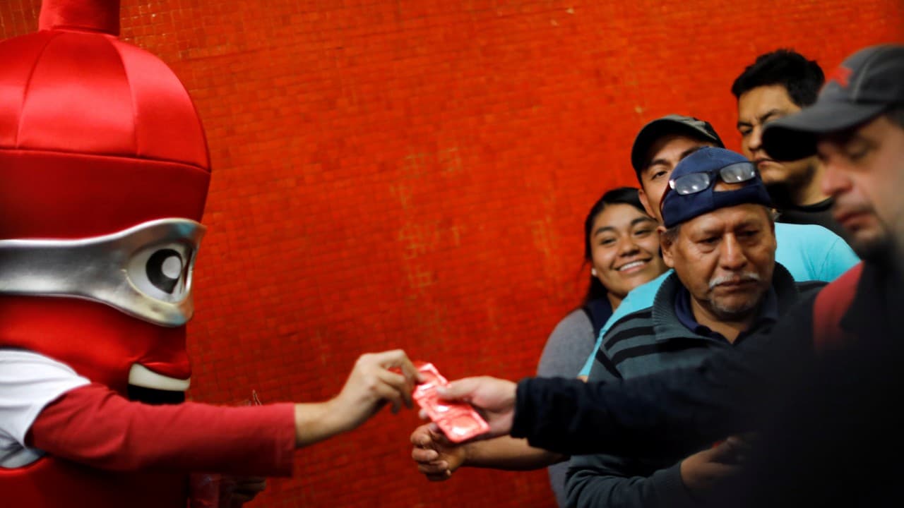Como parte de la celebración del Día de San Valentín, hombres disfrazados de preservativos gigantes y otros voluntarios recorrieron la urbe. ¿El fin? Promover la prevención de enfermedades de transmisión sexual y embarazos no deseados.