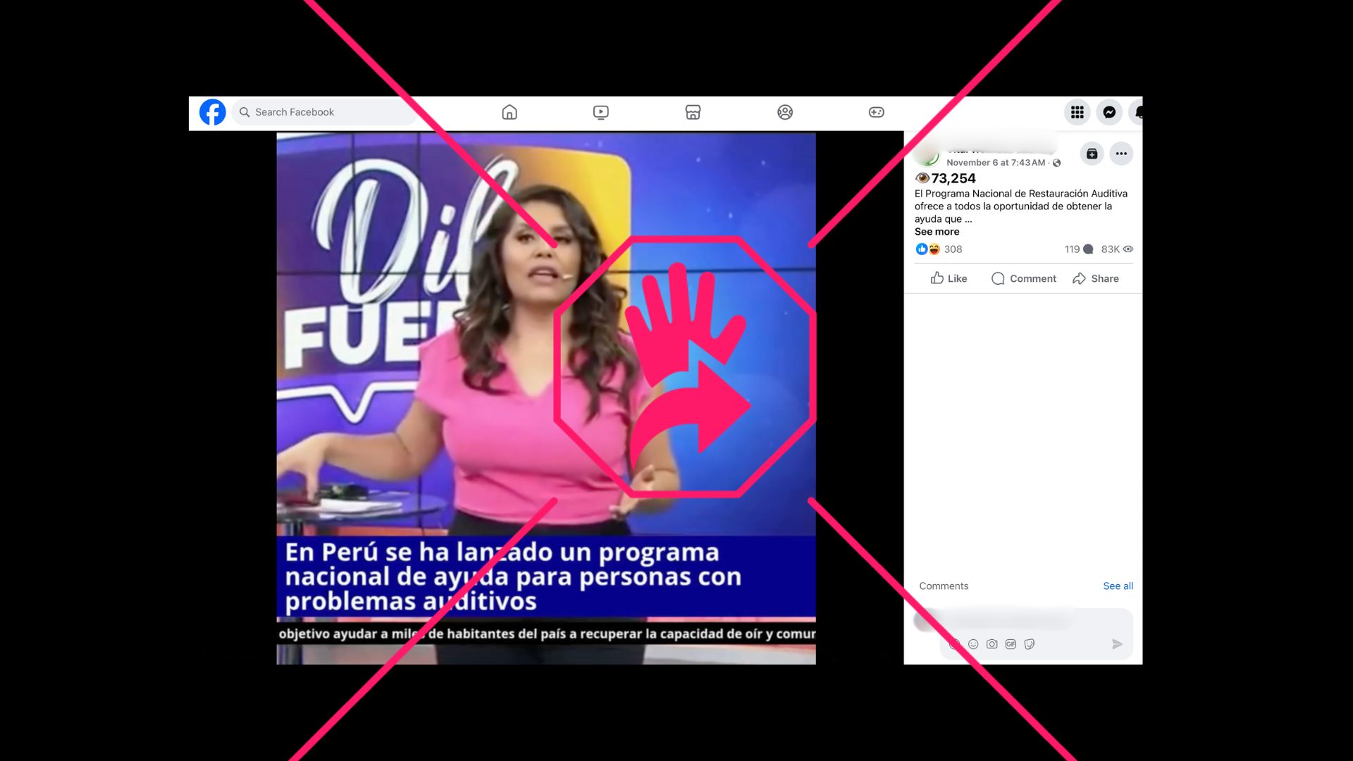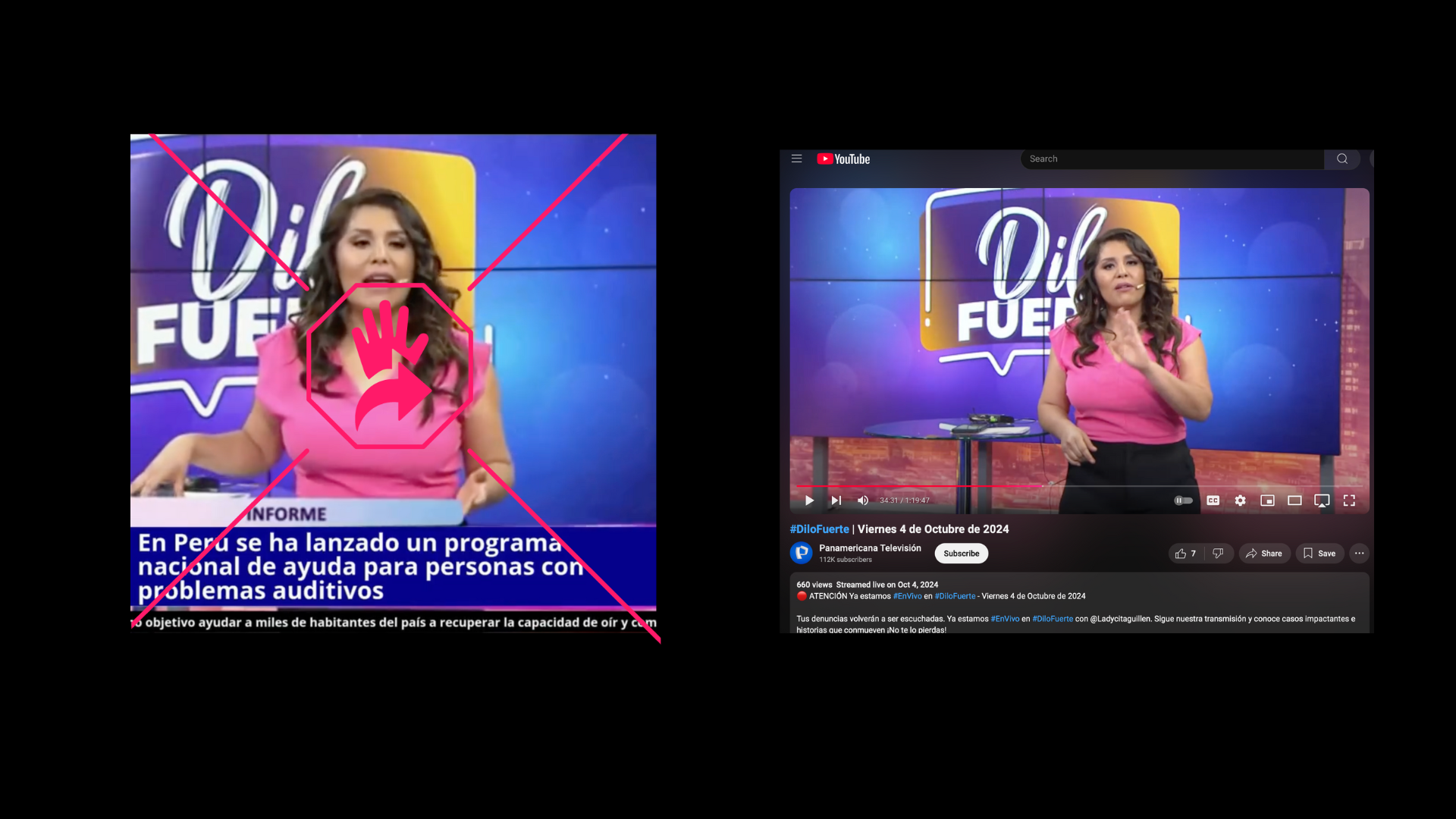 En Facebook circula una publicación que muestra un segmento televisivo de un canal peruano en el que la conductora Laidy Guillén supuestamente anuncia un programa nacional de ayuda para personas con problemas auditivos, respaldado por el otorrinolaringólogo Paulo Pérez Sánchez. Sin embargo, esa afirmación es falsa. El video original fue manipulado: el audio y las imágenes de los clips en los que aparecen Guillén y Pérez Sánchez no tienen relación entre sí y corresponden a contenidos publicados con más de cuatro años de diferencia.