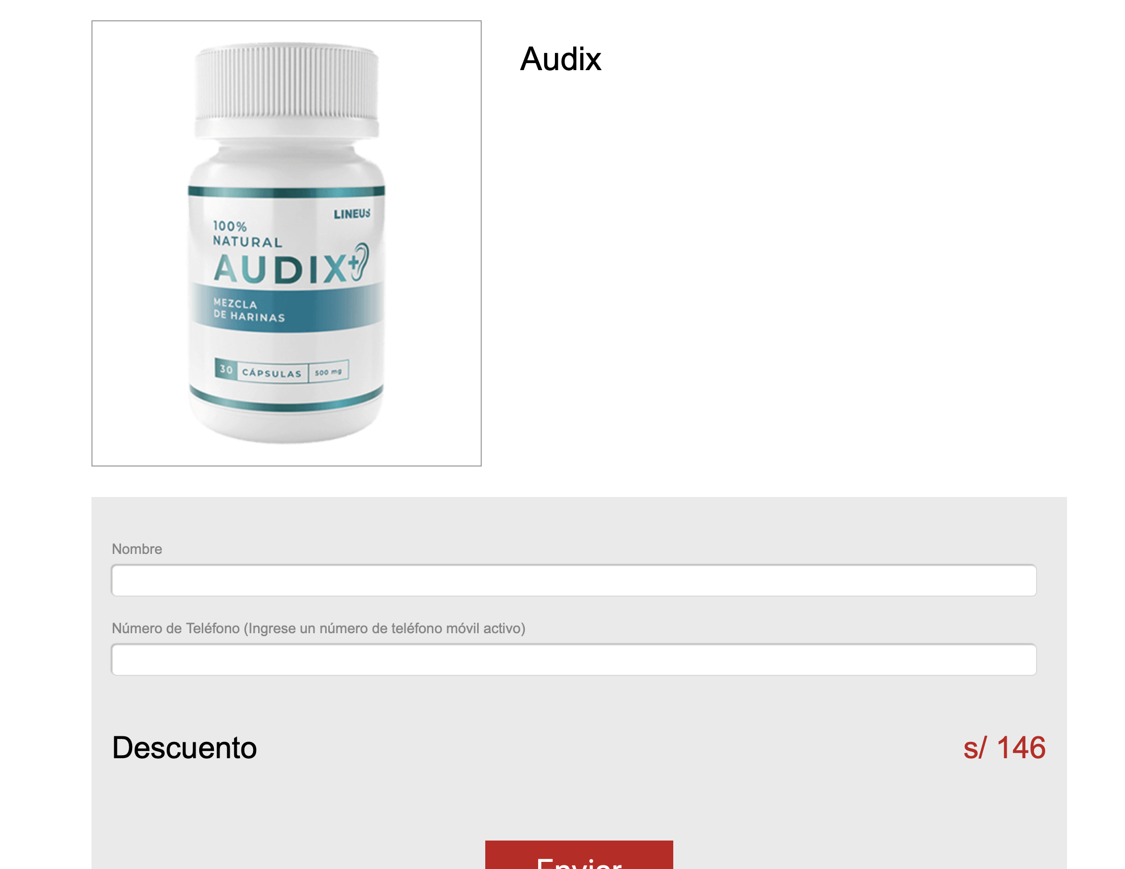 En busca de información adicional, accedimos al enlace proporcionado para inscribirse en la supuesta oportunidad que, según el anuncio, es "por tiempo limitado". En el sitio, que no corresponde a una página web del gobierno, se promociona un supuesto producto llamado Audix, que, según se lee, es una "mezcla de harinas" y solicitan datos personales como "nombre" y "número de teléfono".