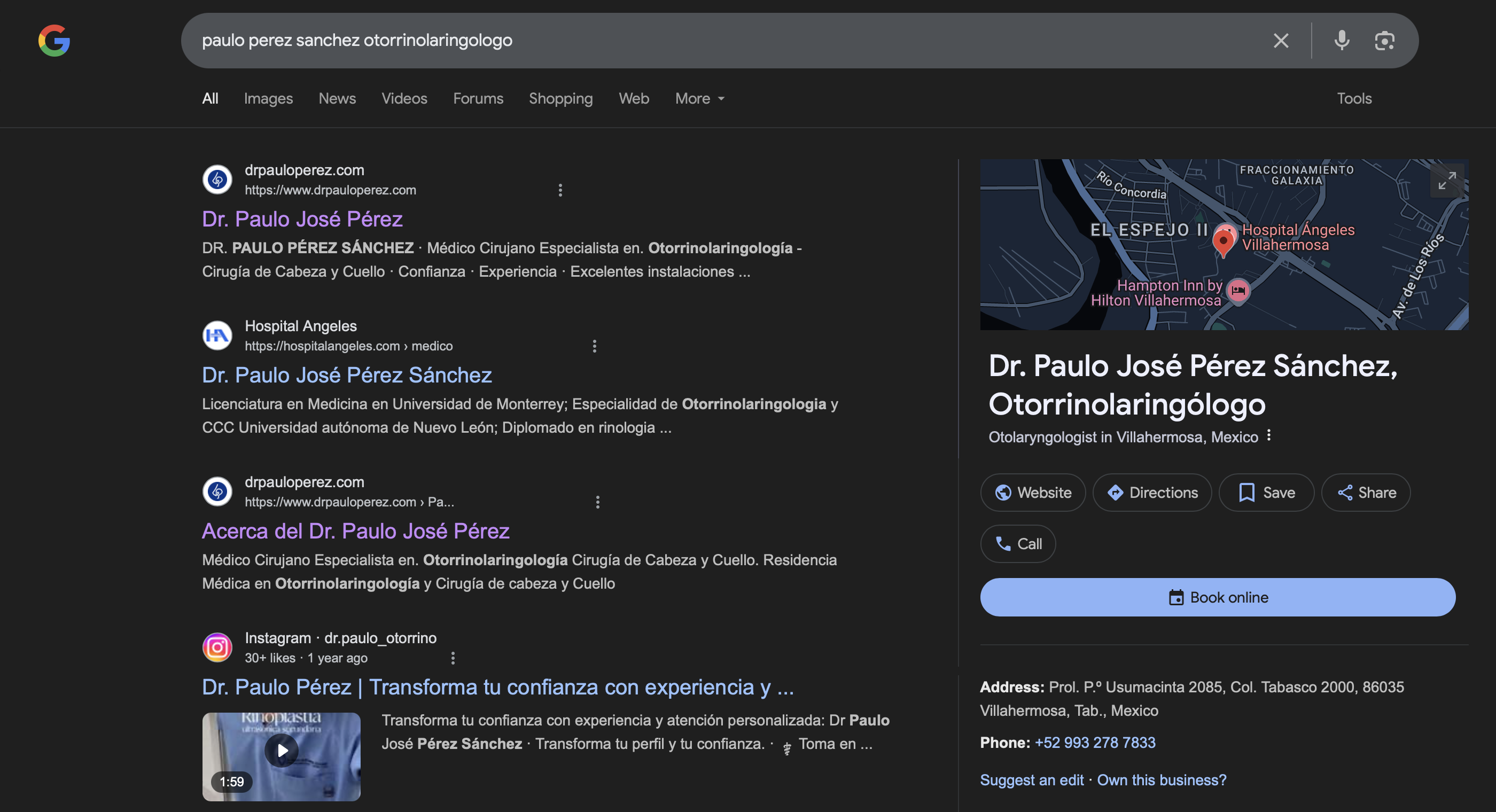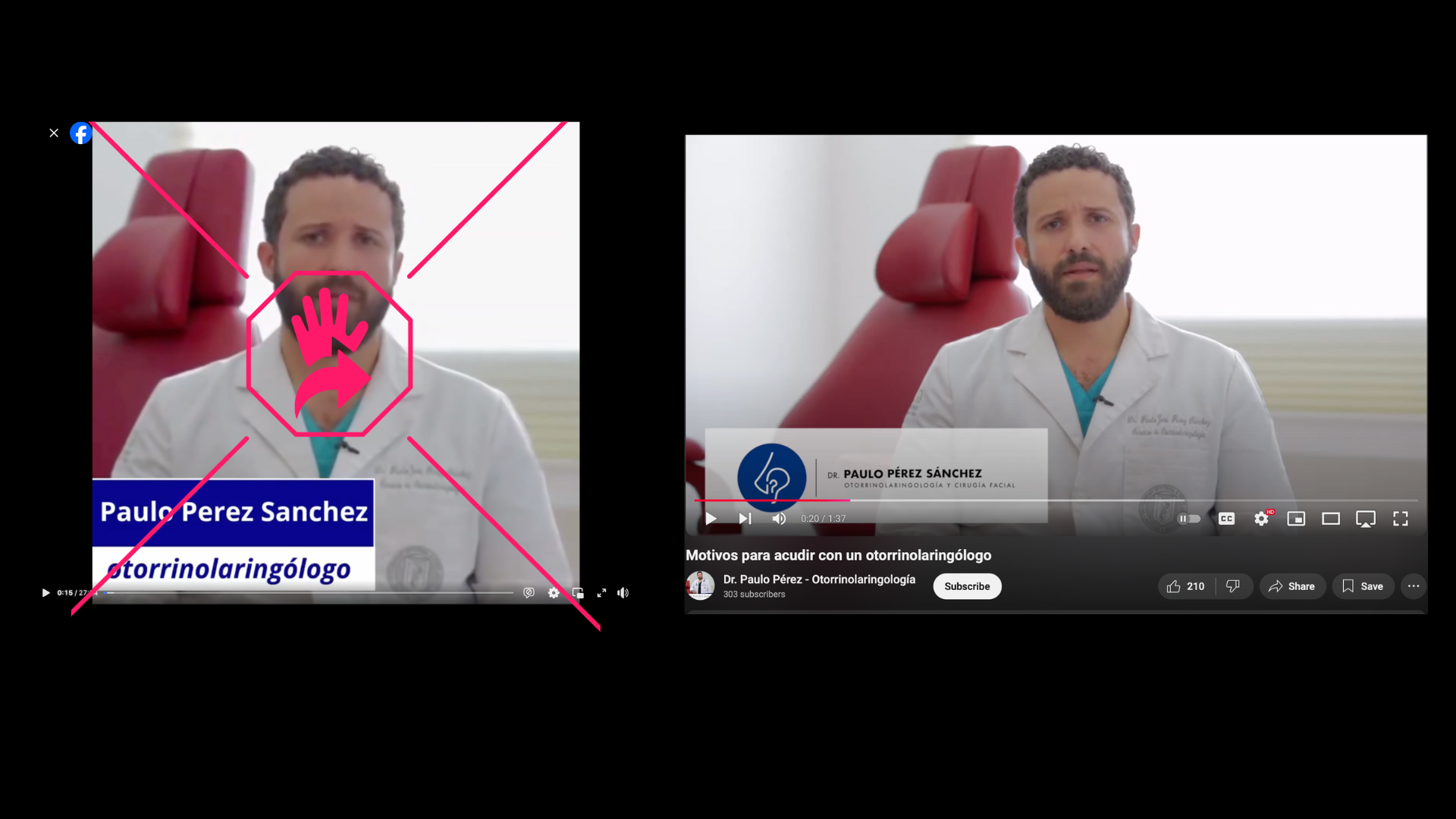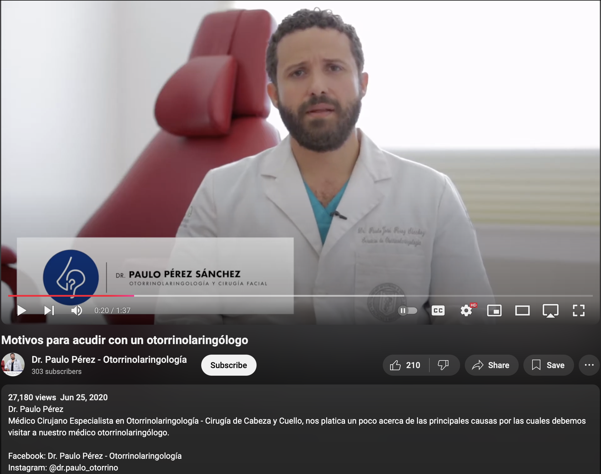 Además, realizamos una búsqueda adicional en Google, esta vez utilizando el nombre "Pérez Sánchez" junto con su especialidad (otorrinolaringología). Esto nos condujo al video original en su cuenta de YouTube, publicado el 25 de junio de 2020. Aunque Pérez Sánchez aparece con la misma vestimenta y encuadre, no menciona ningún programa para personas con problemas de audición ni hace referencia a Perú. En cambio, explica las razones más frecuentes por las que niños y adultos consultan a un otorrinolaringólogo, como la otitis y el dolor de garganta. Además, notamos que el médico está ubicado en México y no en Perú.