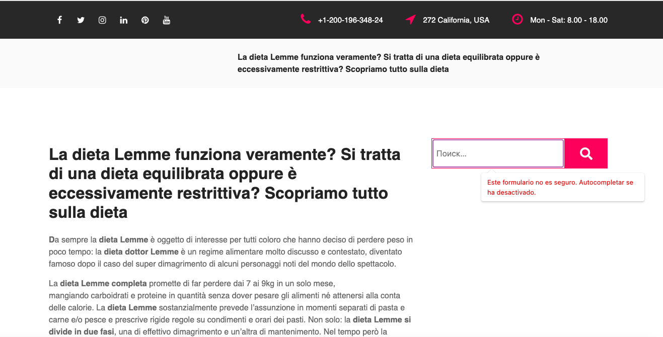 En cuanto a la página web a la que somos dirigidos si hacemos clic en “enviar solicitud”, como nos pide la publicación, se trata de un sitio con un texto en italiano, que tiene una supuesta dirección de California y teléfono estadounidense, con un buscador en el que al colocar el puntero por encima el navegador nos advierte que se trata de un “formulario no seguro”. Todas estas son señales de que no se trata de un sitio confiable para navegar y mucho menos para entregar datos personales o hacer alguna transacción.