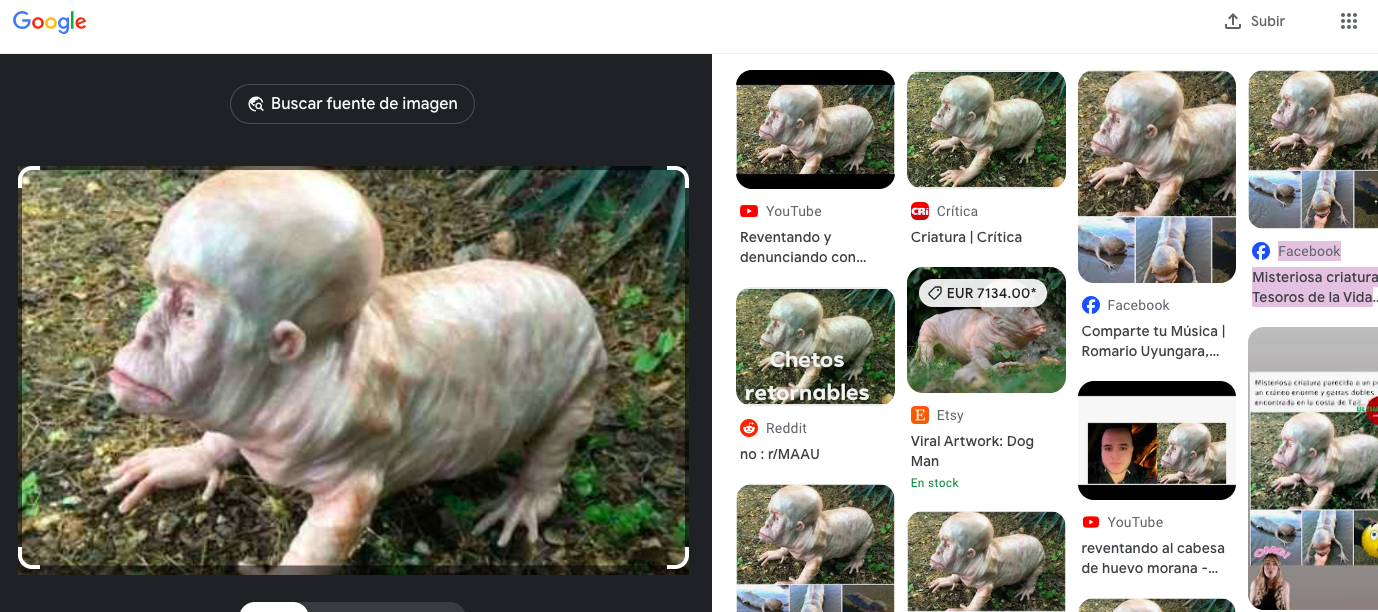 En elDetector realizamos una búsqueda inversa de imagen en Google con la primera de las fotografías y encontramos entre los resultados un enlace a la tienda de la artista italiana Laira Maganuco en la plataforma Etsy, en la que aparece la misma figura con el título “Viral Artwork: Dog Man” (Trabajo artístico viral: Perro hombre). Allí se explica que se trata de una escultura de silicona “tallada totalmente a mano en pasta de silicona acética” creada por Maganuco.