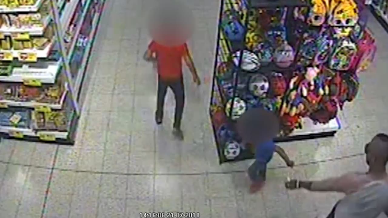 En las imágenes se puede ver cómo un hombre se acerca al hijo, que había ido con su familia a comprar un regalo de cumpleaños, y lo rocía con un líquido antes de que el niño salga corriendo hacia donde aparentemente está la madre.