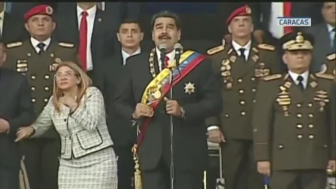 Maduro estaba dando un discurso este sábado en la avenida Bolívar en el centro de Caracas cuando algo que parece ser una explosión se escucha en el fondo. El mandatario se calla, mira hacia arriba y su esposa, la primera dama, Cilia Flores se agacha como tratando de esquivar algo que está en el aire.