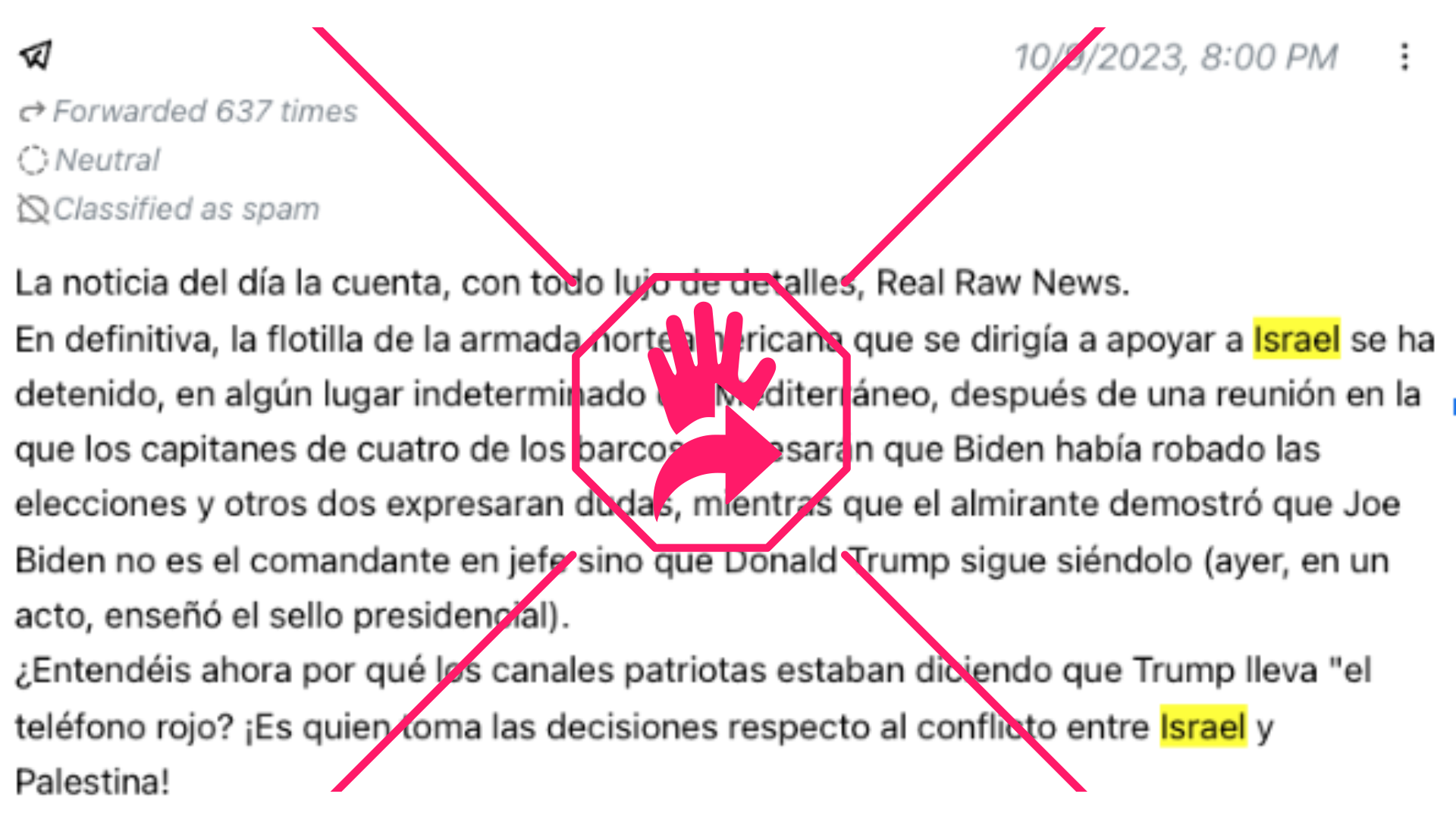 El segundo mensaje que quiero analizar también circula en Telegram y afirma que "la flotilla de la armada norteamericana que se dirigía a apoyar a Israel” se detuvo en el mar Mediterráneo después de que los comandantes de los barcos se reunieron y supuestamente decidieron expresar que el presidente Joe Biden había robado las elecciones de 2020. Un chiste absurdo. En este artículo, Associated Press detalla todo el aparato militar enviado por Estados Unidos y cuenta cuándo las embarcaciones llegaron o llegarán.
