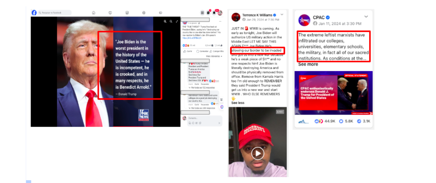 El mes pasado, los seguidores de Trump en Facebook compartían narrativas igualmente falsas. La víctima esta vez era su adversario político, Joe Biden. Publicaciones realizadas por activistas republicanos difundían la idea de que el mundo está cerca de la Tercera Guerra Mundial debido a la supuesta "invasión" de inmigrantes a Estados Unidos. Una idea basada en una serie de videos falsos que se volvieron virales en el país en 2023.