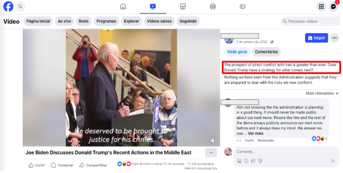Hace cuatro años, los demócratas decían en Facebook que Trump no tenía ninguna estrategia para lidiar con Irán y que el ataque con dron que resultó en la muerte del general iraní Qasem Soleimani sería entendido como una declaración de guerra. El mes pasado, decenas de páginas que apoyan la reelección de Biden publicaron mensajes cuestionando la capacidad mental de Trump para volver a ser presidente.