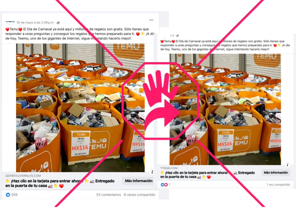 “Temu. El Día de Carnaval ya está aquí y millones de regalos son gratis. Sólo tienes que responder a unas preguntas y conseguir los regalos que hemos preparado para ti. ¡A día de hoy, Teemu [sic], uno de los gigantes de Internet, sigue intentando hacerlo mejor!”, dice el texto de varias publicaciones de Facebook, que van acompañadas de una imagen en la que se ven cajas naranjas con el logo de la plataforma de comercio electrónico llenas de productos y algunas de las cuales llevan una etiqueta que dice que su valor es de 16 pesos mexicanos (0.91 dólares).