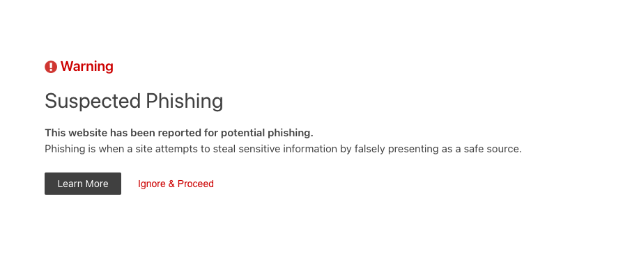 Hicimos clic en el enlace proporcionado para responder las supuestas preguntas y el navegador nos advirtió que la página web a la que estábamos siendo redirigidos no era segura y había sido denunciada por phishing, una técnica usada por ciberdelincuentes para engañar a los usuarios y hacer que descarguemos virus o compartamos datos confidenciales o personales.