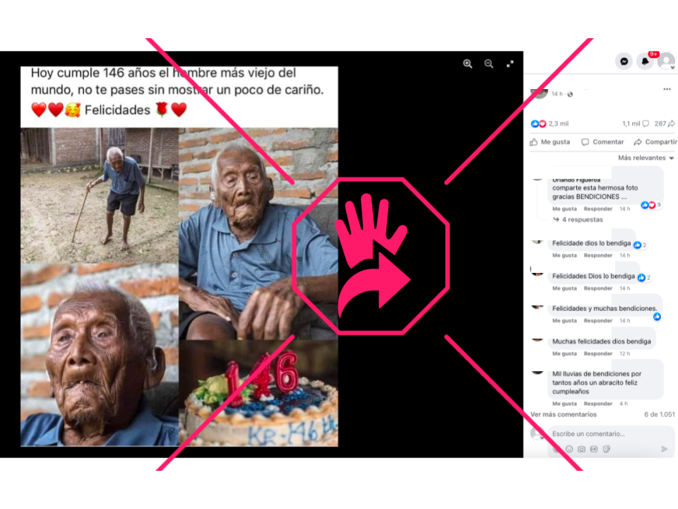 El “hombre más viejo del mundo” no está cumpliendo 146 años “hoy”, como dice ese post publicado en Facebook. La celebración ocurrió en 2016 y el anciano que aparece en las imágenes, Saparman Sodimejo, falleció en 2017. Además, aunque el hombre aseguraba tener esa edad, su fecha de nacimiento no pudo ser verificada, por lo que nunca ostentó oficialmente el récord de la persona más vieja.