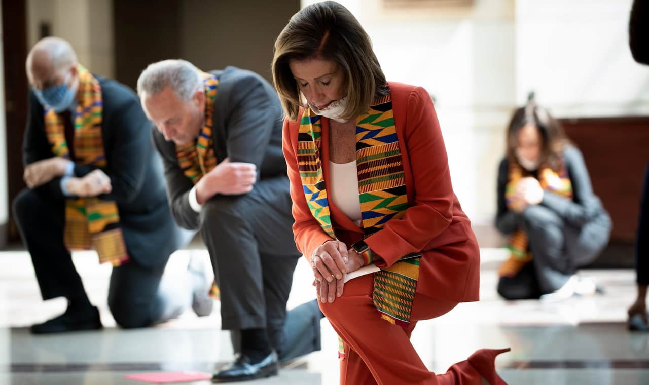 Por 8 minutos y 46 segundos los miembros demócratas del Congreso se pusieron de rodillas. Ese es el tiempo que la rodilla del policía Derek Chauvin estuvo el cuello de George Floyd, causándole su muerte.