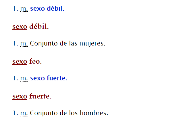 Hasta ahora, al hacer una búsqueda en el diccionario de la Real Academia Española se podía encontrar la expresión 'sexo débil' como sinónimo de conjunto de mujeres y, por el contrario, 'sexo fuerte' para definir a los hombres. Sin embargo, se espera que esto cambie en la actualización que tiene previsto publicar en línea en diciembre.