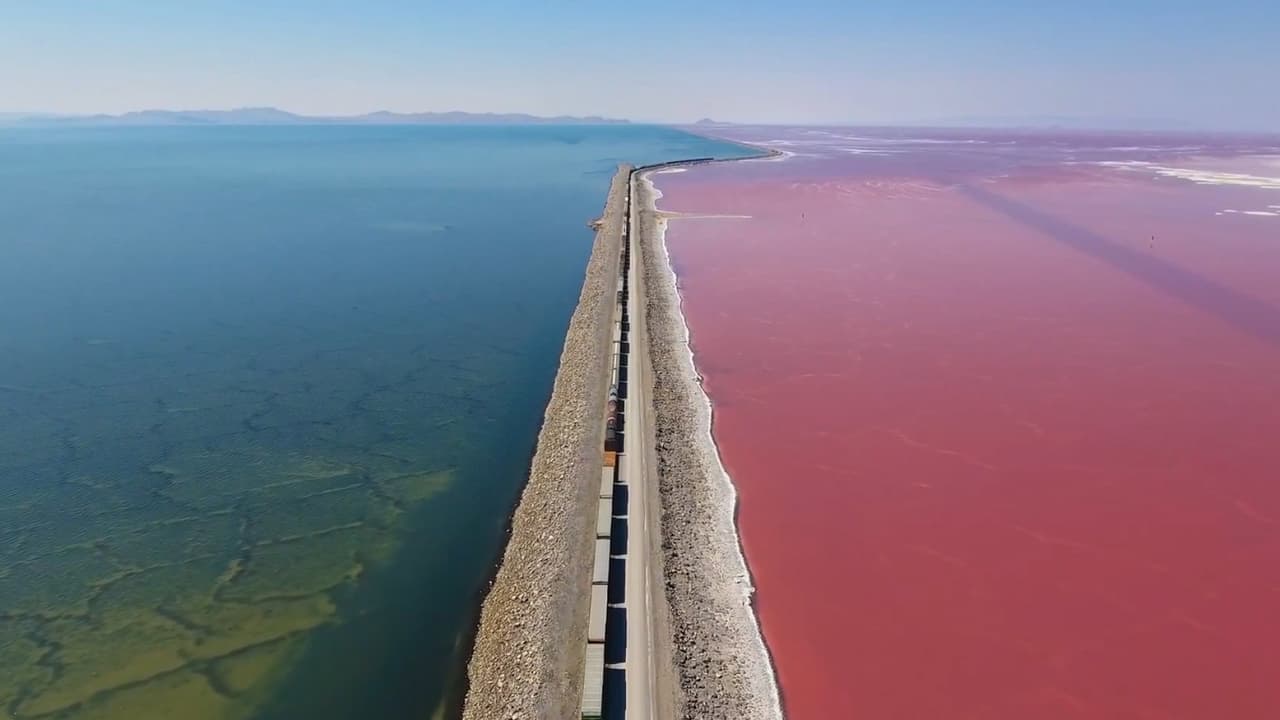 El grado de salinidad y la vía del tren que lo cruza son claves en el enigmático color rosado de la mitad del Great Salt Lake.