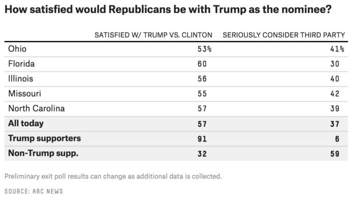 Esta tabla que publica ‘FiveThirtyEight’ refleja la insatisfacción de muchos republicanos con la candidatura del millonario neoyorquino e indica que un porcentaje notable de los republicanos apoyaría a un tercer candidato en noviembre.