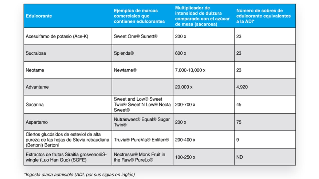 Los edulcorantes artificiales están en todas partes, pero todavía se está deliberando sobre si estos productos son inofensivos. También llamados "edulcorantes no nutritivos", pueden ser sintéticos –como la sacarina y el aspartame– o derivados naturalmente, como el esteviol, que proviene de la planta de stevia. Hasta la fecha, la Administración de Alimentos y Medicamentos de EEUU ha aprobado seis tipos de edulcorantes artificiales y dos tipos de edulcorantes naturales no nutritivos para su uso en alimentos.