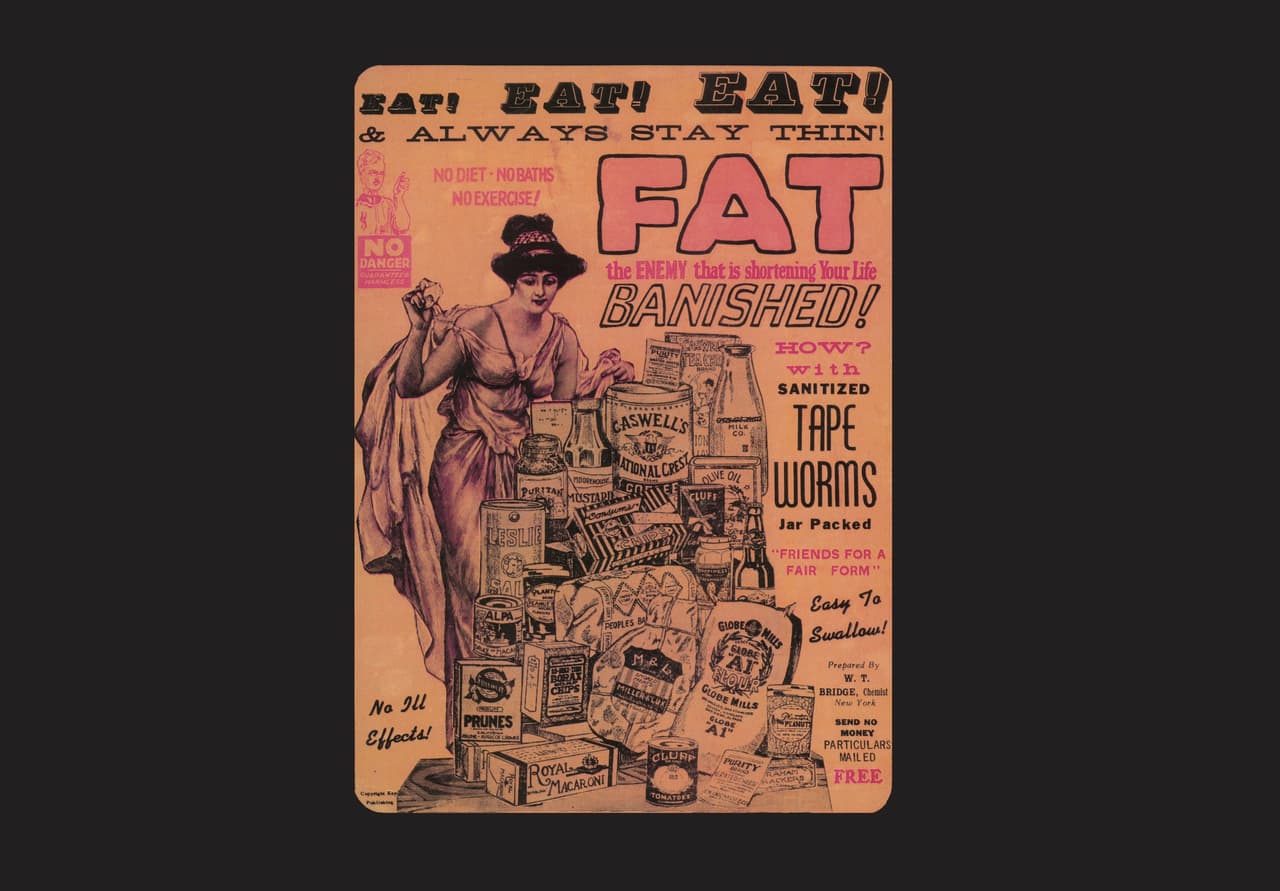 Otro método que se decía que era popular a principios del siglo XX fue la dieta tenia. Teóricamente, uno se tragaría una tenia o unas pastillas con tenias (lombriz solitaria). El gusano luego viviría en el estómago y consumiría algo de la comida que se ingiriera. Si bien se han encontrado anuncios antiguos, no hay evidencia de que realmente se vendieran tenias.