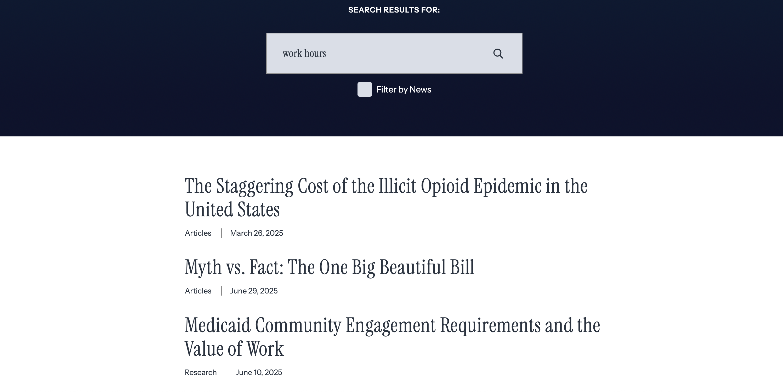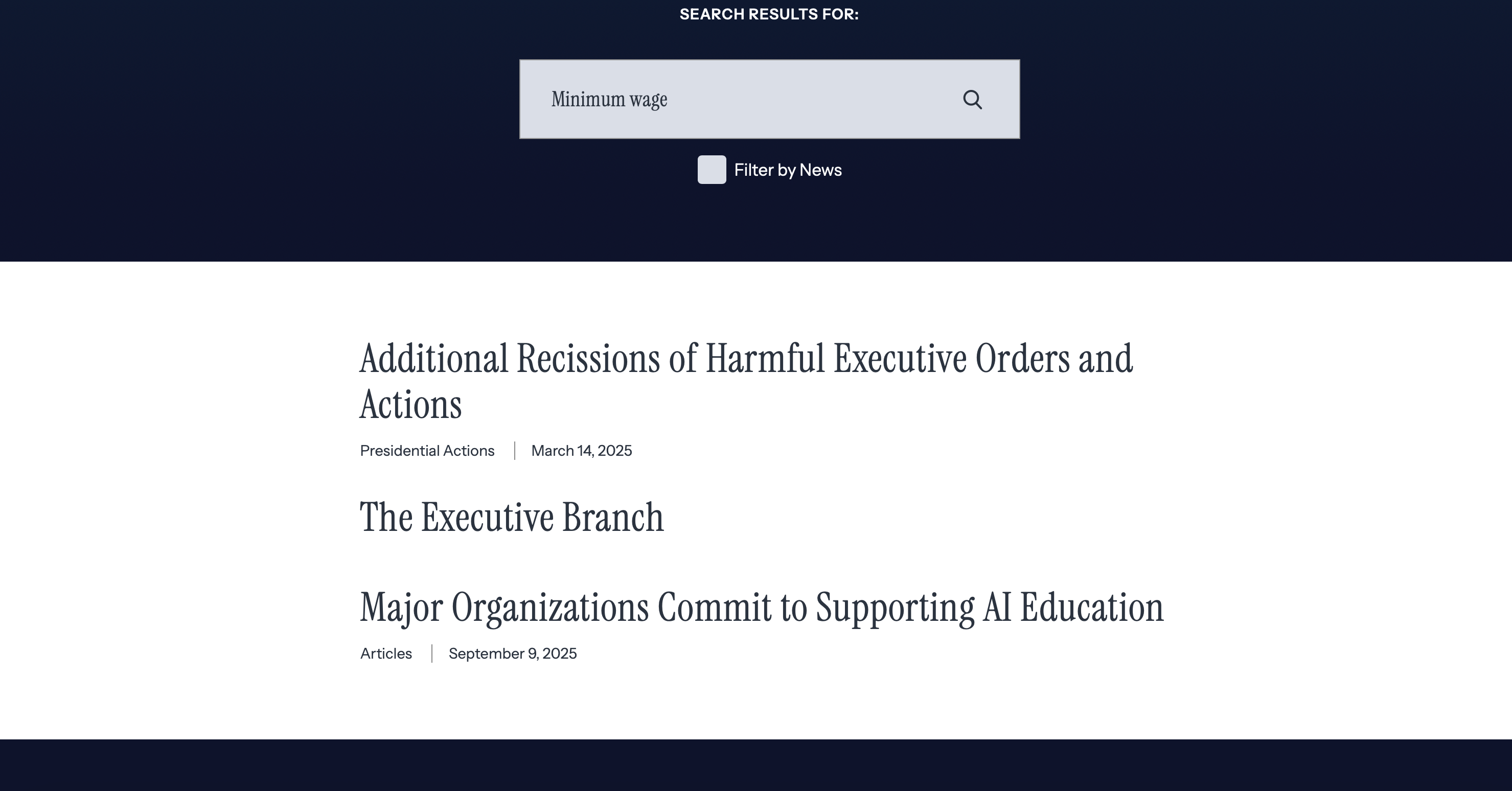 Desde elDetector realizamos búsqueda en inglés con las palabras clave “salario mínimo” y “horas de trabajo” en el sitio oficial de la Casa Blanca. Entre los resultados, no encontramos ninguna orden ejecutiva ni declaración que respalde un supuesto ajuste al salario mínimo federal, ni que permita laborar “únicamente cuatro horas” al día.