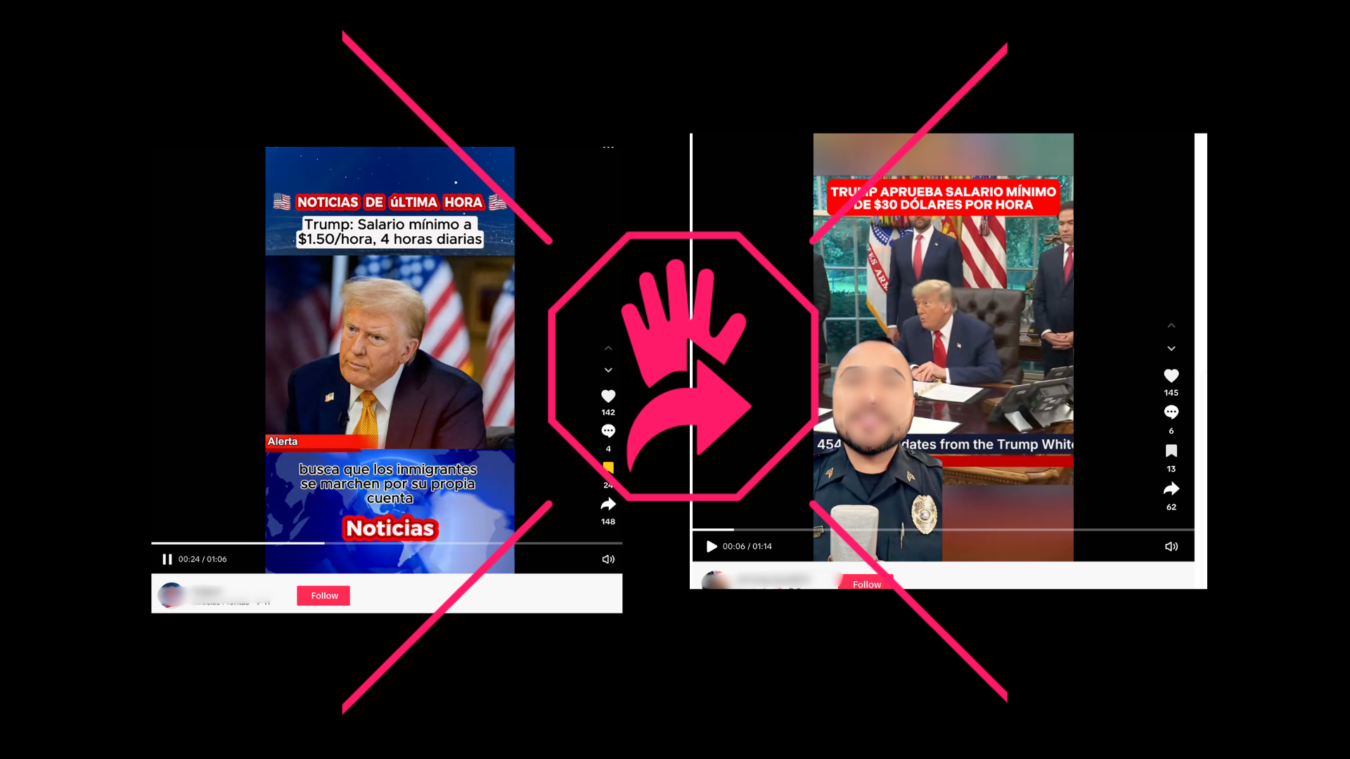 Uno de los videos dice que el “presidente aseguró que el salario mínimo bajará a solo 1.50 dólares por hora y que los trabajadores podrán laborar únicamente 4 horas al día”, argumentando, supuestamente, “que con esta medida busca que los inmigrantes se marchen por su propia cuenta”.