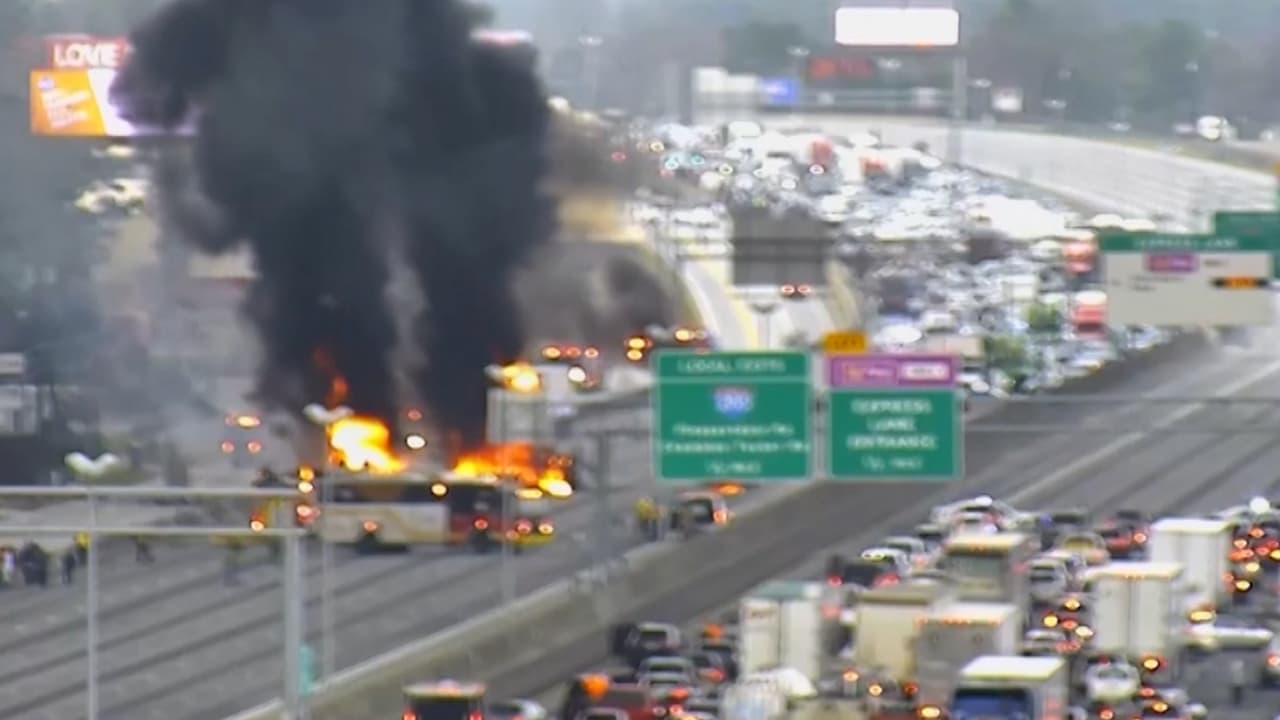Los bomberos tuvieron que cerrar todas las lineas de una congestionada carretera en Atlanta, Georgia, y evacuar de sus autos a los conductores que estaba cerca del accidente.