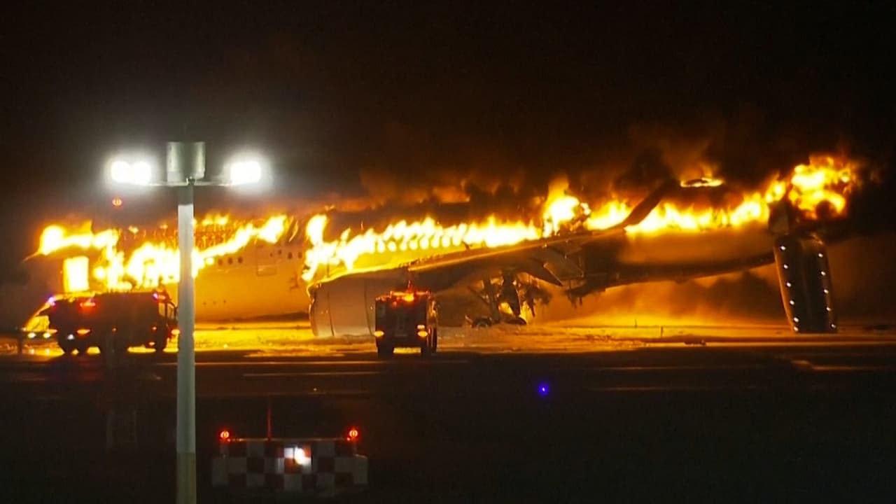 Un avión de Japan Airlines se incendió en el aeropuerto de Haneda, en Tokio, tras chocar contra una aeronave de la Guardia Costera que llevaba ayuda a la zona afectada por el terremoto en Japón. Los 379 pasajeros a bordo lograron escapar, pero cinco de los tripulantes del otro aparato perdieron la vida. Más información