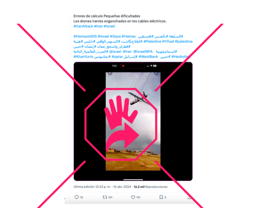 Un video en el que se ve un dron enredado en cables del tendido eléctrico en lo que parece ser una zona rural circula en redes sociales con mensajes que aseguran que corresponde a un aparato que formaba parte de la ofensiva iraní contra Israel, iniciada el 13 de abril de 2024, que falló en llegar a su objetivo. Sin embargo, en realidad la grabación había sido compartida en internet en febrero de este año y localizada en Siria.