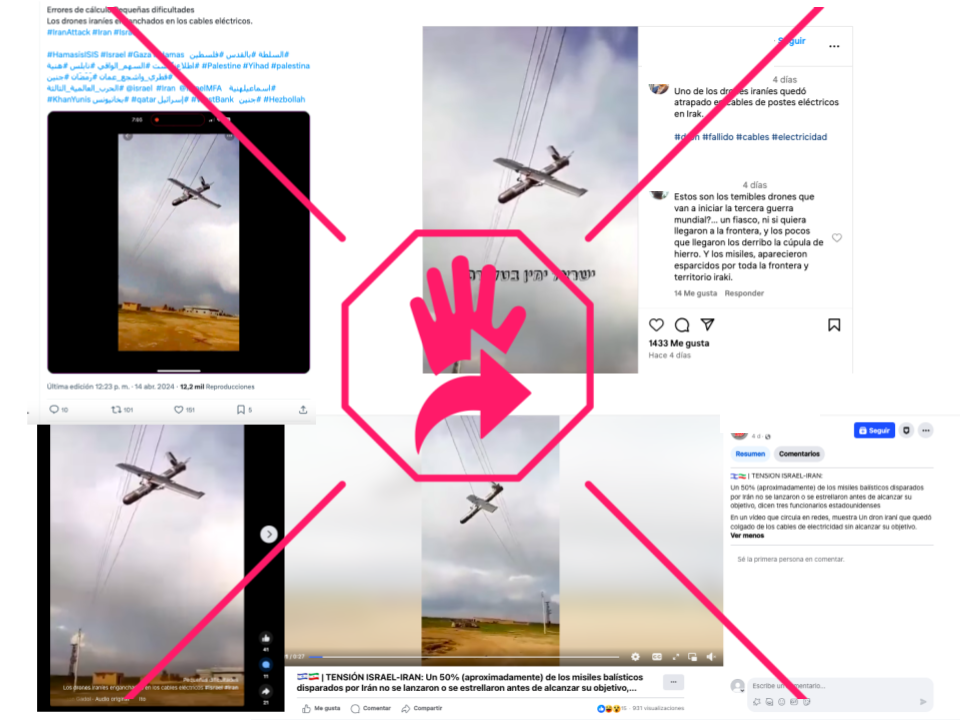 “Errores de cálculo. Pequeñas dificultades. Los drones iraníes enganchados en los cables eléctricos. #IranAttack #Iran #Israel”, dice un post compartido en X (antiguo Twitter) el 14 de abril y que sumaba más de 12,000 reproducciones cinco días después. “Uno de los drones iraníes quedó atrapado en cables de postes eléctricos en Irak”, “Un dron iraní que quedó colgado de los cables de electricidad sin alcanzar su objetivo”, señalan también publicaciones en Instagram y Facebook.
