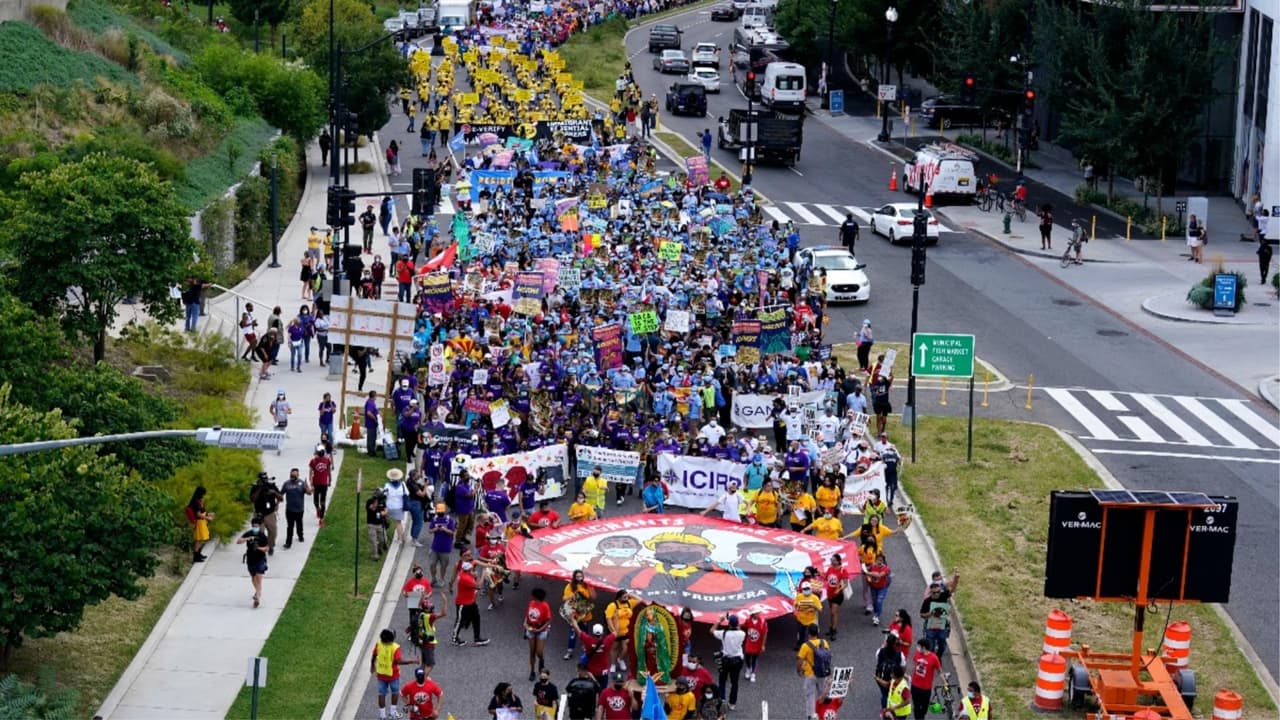 Inmigrantes y grupos que los apoyan protestan en Washington DC tras el rechazo al proyecto de presupuesto que incluía el plan migratorio del presidente Joe Biden y que permitiría el ajuste al estatus de millones de personas en EEUU. Los manifestantes aseguran que los demócratas aún tienen las vías para aprobar esta iniciativa en el Congreso.