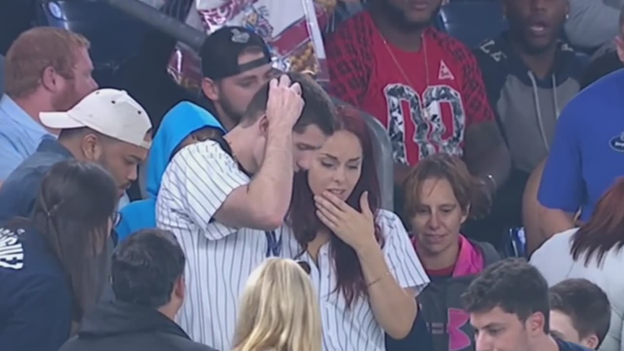 Un novio nervioso pasó de la emoción a la angustia cuando el anillo de compromiso que llevó al Estadio de los Yankees para pedirle matrimonio a su novia, se le cayó entre las butacas. Aficionados que estaban cerca de la pareja ayudaron a buscar la sortija entre los asientos y las palomitas de maíz hasta que finalmente la encontraron.