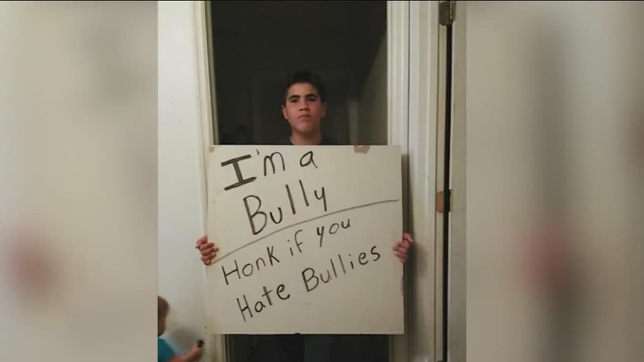 De pie y con un cartel con la frase "soy un 'bully'", el controversial castigo de un padre a su hijo