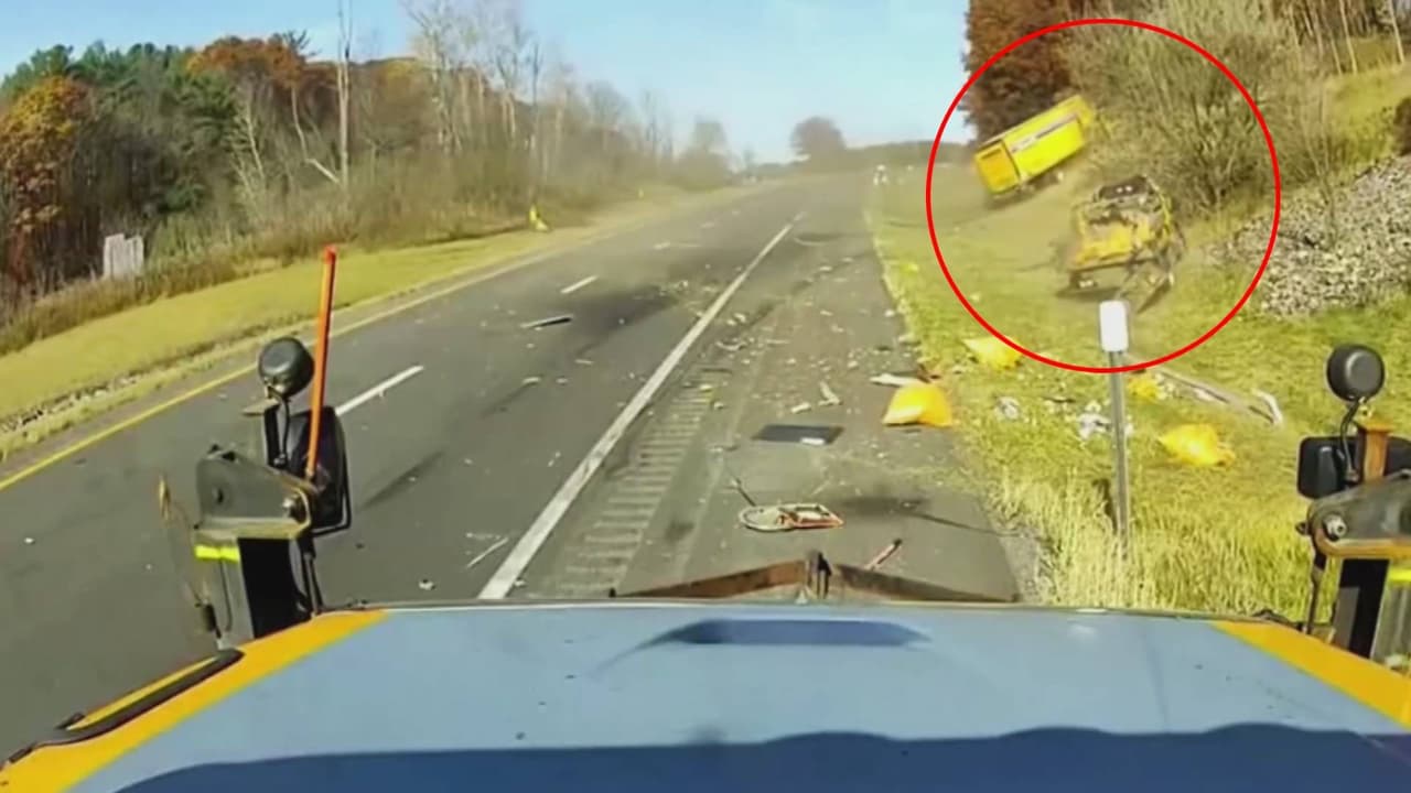 El conductor de un camión de la compañía Penske perdió el control del vehículo y terminó chocando contra una zona de obras en una carretera de Nueva York. Un trabajador logró esquivarlo, pero estuvo muy cerca de ser atropellado.