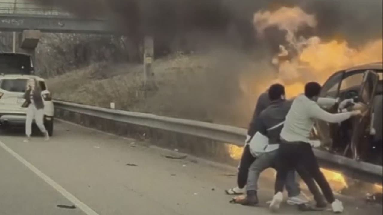 El momento en que varias personas salvan a un conductor atrapado en un auto en llamas