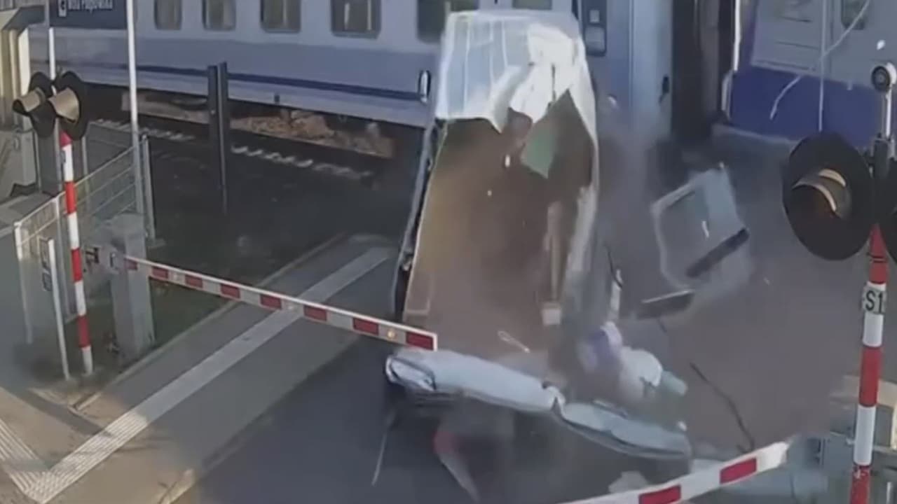 Un video publicado por la policía de Polonia muestra el momento en que una furgoneta es impactada por un tren a gran velocidad en un cruce ferroviario. La camioneta quedó reducida a chatarra, pero el conductor salió ileso. No se reportó ningún pasajero del tren herido tras el accidente.
