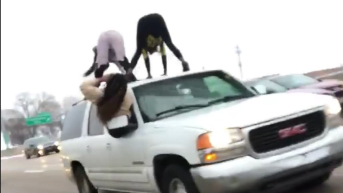 Graban a dos mujeres bailando sobre el techo de un carro en movimiento