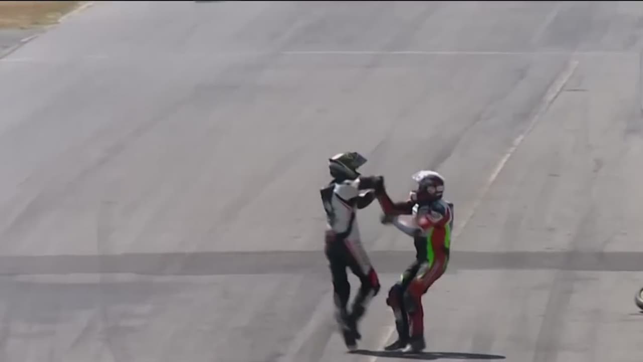 Pilotos se pelean en medio de la pista de un campeonato de motos en Costa Rica