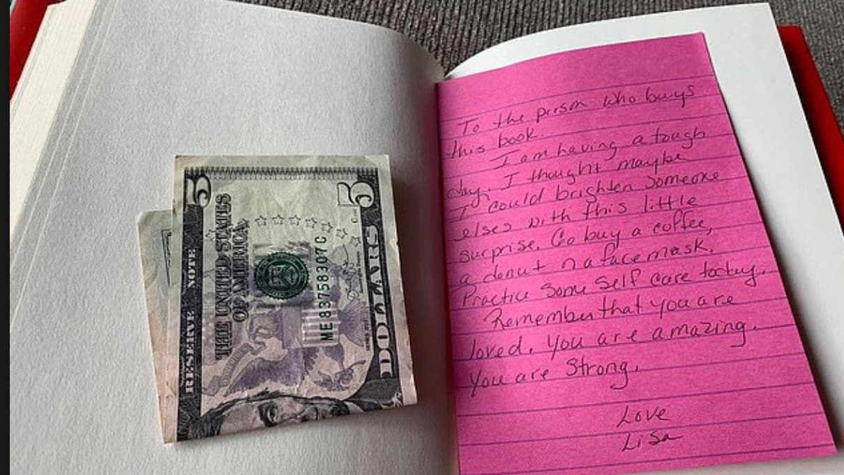 Se hace viral una nota y un billete de cinco dólares encontrado en un libro