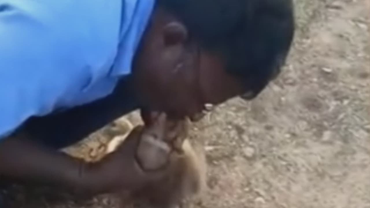 En video quedó grabado cómo el hombre en India lucha angustiosamente por revivir al animal que previamente había sido atacado por unos perros. Al lograr estabilizar al mamífero, el mono le da un abrazo como si fuera una muestra de agradecimiento por haberlo salvado.